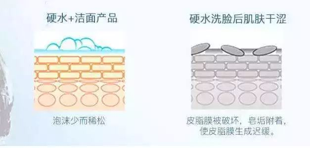 硬水中的钙镁离子遇到洗面奶中的皂基时,就会产生"皂垢残留",它像小石子一样牢牢的粘附在你的脸上,不断摩擦,导致皮脂膜无法再生,角质层也会受到损害,从而导致肌肤的锁水能力变差,使各种护肤品的吸收能力变差,长此以往下去,会造成肌肤缺水、干燥。